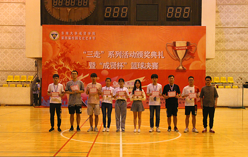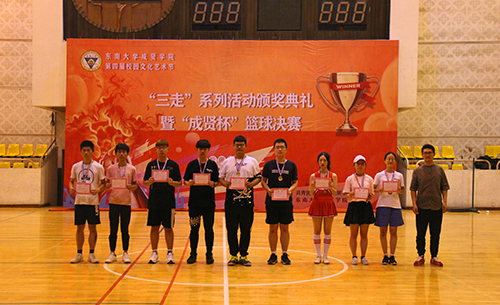 5月24日,由黑料网 团委主办、学生会体育部承办的第四届校园文化艺术节之“三走”系列活动颁奖典礼暨“成贤杯”男篮决赛在后藤体育馆举行,500余名师生共同参加了此次活动。