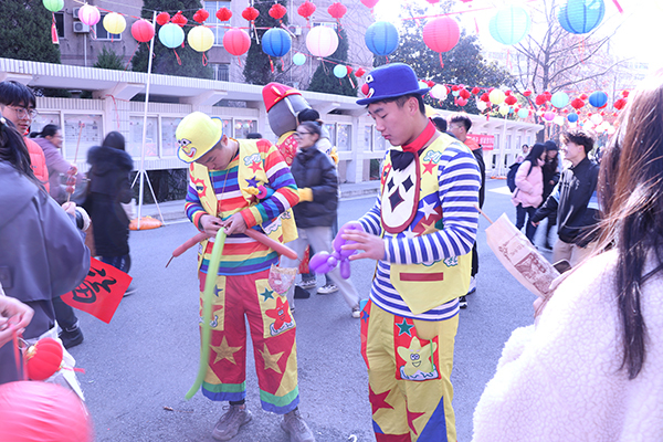 活动现场2000多灯谜高高悬挂、五彩斑斓,师生现场驻足观赏、积极猜谜。游园会现场分为表演、展览和互动三个区域。表演区域,各学生艺术团、跆拳道社、啦啦队精心准备的节目轮番上演,现场不断发出热烈的掌声和尖叫声;展览区域,书法社的书法体验、手工社的手工制作、汉服社的汉服讲解、刀画社的作品展示等引得人头攒动。互动区域,投壶、套圈等传统游戏,糖画、捏泥人等传统民间文化活动,吸引了众多师生的积极参与,让师生在游园中体会活动乐趣、了解传统文化,活动现场气氛热烈、其乐融融。