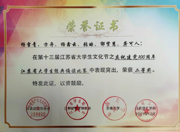 第十三届江苏省大学生文化节之庆祝建党100周年江苏省大学生经典诵读比赛荣誉证书